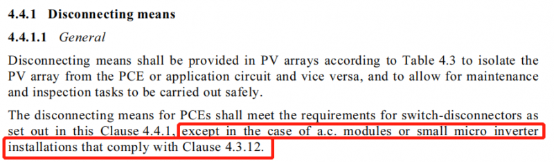 根據AS/NZS 5033:2014標準中提到:對非交流組件或小型微型逆變器安裝的系統(tǒng)而言,組件和逆變器之間需要安裝斷開裝置;對交流組件或小型微型逆變器安裝的系統(tǒng)則不需要安裝直流側斷開裝置。
