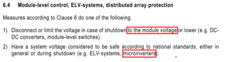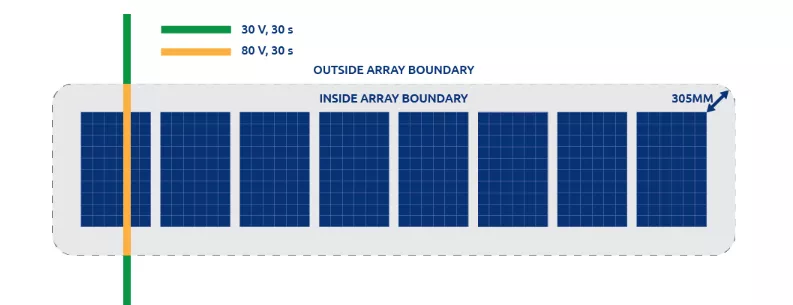 規(guī)范每三年更新一次,在全美范圍內有效,但不同的州可執(zhí)行不同版本的規(guī)范。在最新版的NEC2020文件中要求:以距離到光伏矩陣305mm為界限,界限范圍外,在觸發(fā)設備啟動后30S內,電壓降低到30V以下,界線范圍內,要求具有“光伏危險控制系統(tǒng)”,或在觸發(fā)設備啟動后30S內,將電壓降低到80V以下,也就是要求實現“組件級關斷”。