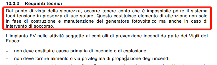 意大利標準 CEI 82-25標準明確指出:“從安全的角度來看,必須考慮到在有陽光的情況下無法安全關閉光伏系統(tǒng)的情況。這不僅是光伏發(fā)電系統(tǒng)的建造和維護階段的一個注意事項,而且在緊急干預的情況下也是如此。”
