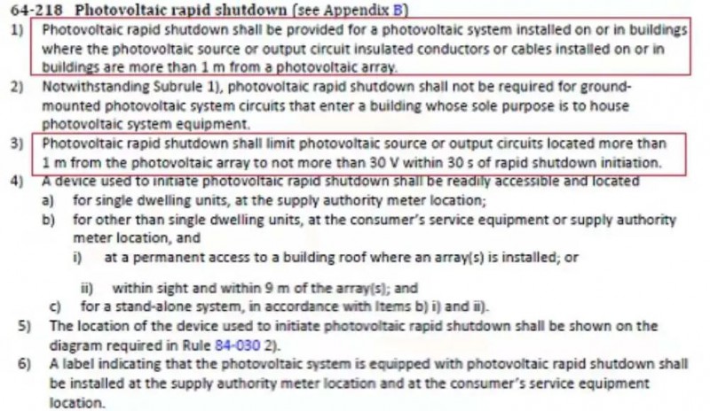另外,法規(guī)中還規(guī)定了:當光伏系統(tǒng)安裝在建筑內或者建筑上,應安裝快速關斷裝置。在光伏組件1米外,快速關斷裝置觸發(fā)后,要求30S內將電壓降低至30V以下。