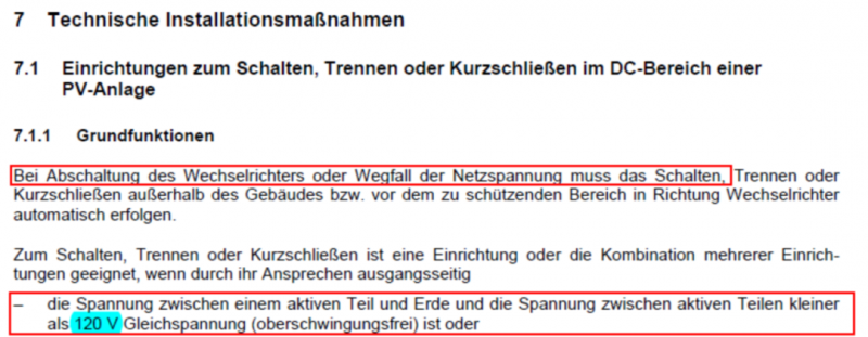 根據德國標準 VDE-AR-E 2100-712要求:在光伏系統(tǒng)中如果逆變器關閉或者電網出現故障時,需要使直流電壓小于120V。其中,提到了可以使用關斷裝置使直流側電壓降至120V以下。