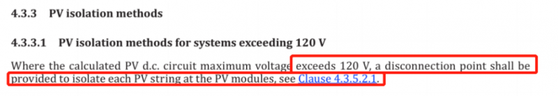 根據最新AS/NZS 5033:2021標準的4.3.3章節(jié)提到:當直流電壓大于120Vd.c時,組件和逆變器之間需要安裝斷開裝置。