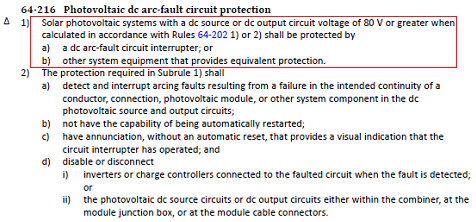 根據加拿大電氣安裝法規(guī) Canadian Electrical Code 2021版要求:光伏系統(tǒng)直流側電壓大于80V時需安裝電弧故障中斷設備或者其它等同設備。