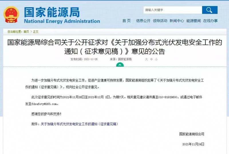 2021年11月26日,國家能源局發(fā)布了關于公開征求對《關于加強分布式光伏發(fā)電安全工作的通知(征求意見稿)》意見的公告。其中,在“項目設計管理”相關章節(jié)中明確要求:安裝電弧故障斷路器或采用具有相應功能的組件,實現電弧智能檢測和快速切斷功能;光伏組件應具有安全關斷保護功能,保證逆變器關機,交流斷電后,系統(tǒng)子陣外直流電壓低于安全電壓。