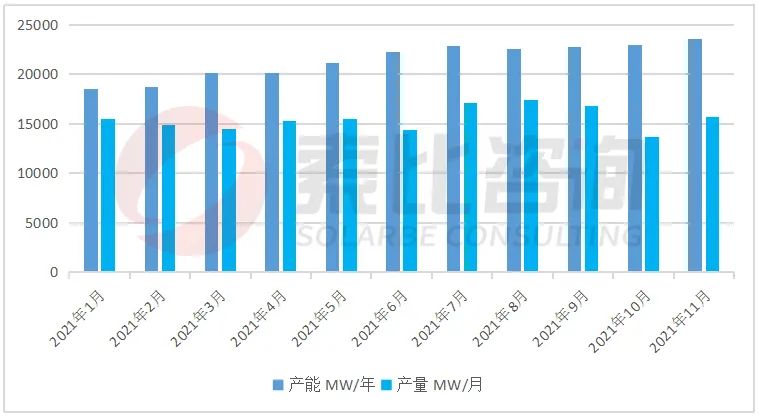 2021年底中國硅料總產(chǎn)能78萬噸,硅料總產(chǎn)量達48.78萬噸,預(yù)計2022年底硅料總產(chǎn)能達115萬噸,但2022年H1硅料仍持相對緊缺的狀態(tài),下半年或有緩解。