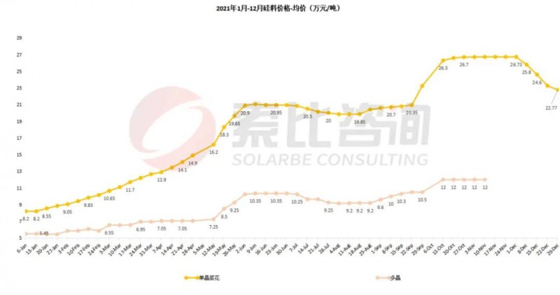 近兩年供應(yīng)短缺預(yù)期明確之后,硅片企業(yè)為了保證供應(yīng),紛紛與硅料廠家簽訂長單。據(jù)統(tǒng)計,2020-2021年超215萬噸硅料長單被簽訂,約占我國2~3年的供應(yīng)量。2021年年底硅料價格較年初漲幅達177.2%,最高達270元/KG,12月受硅料價格下調(diào)及新產(chǎn)能釋放影響,價格下調(diào)。