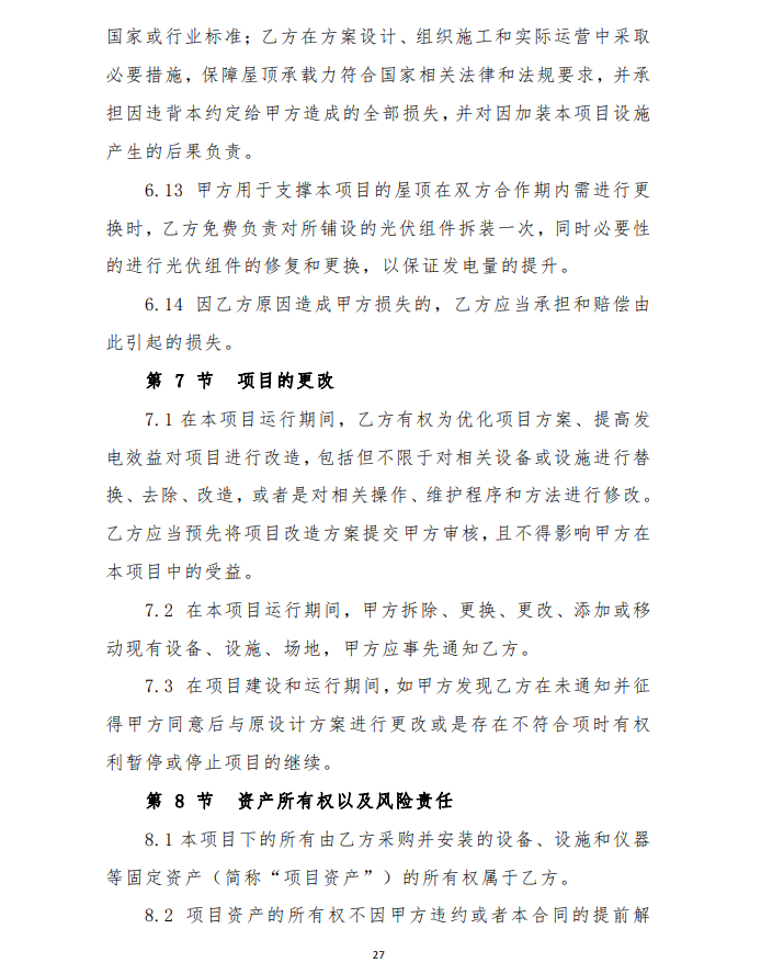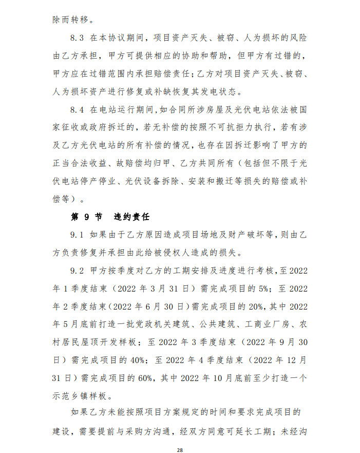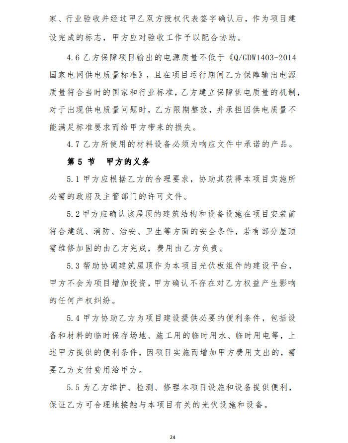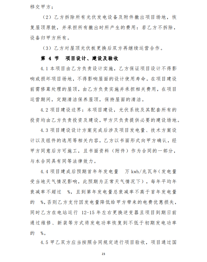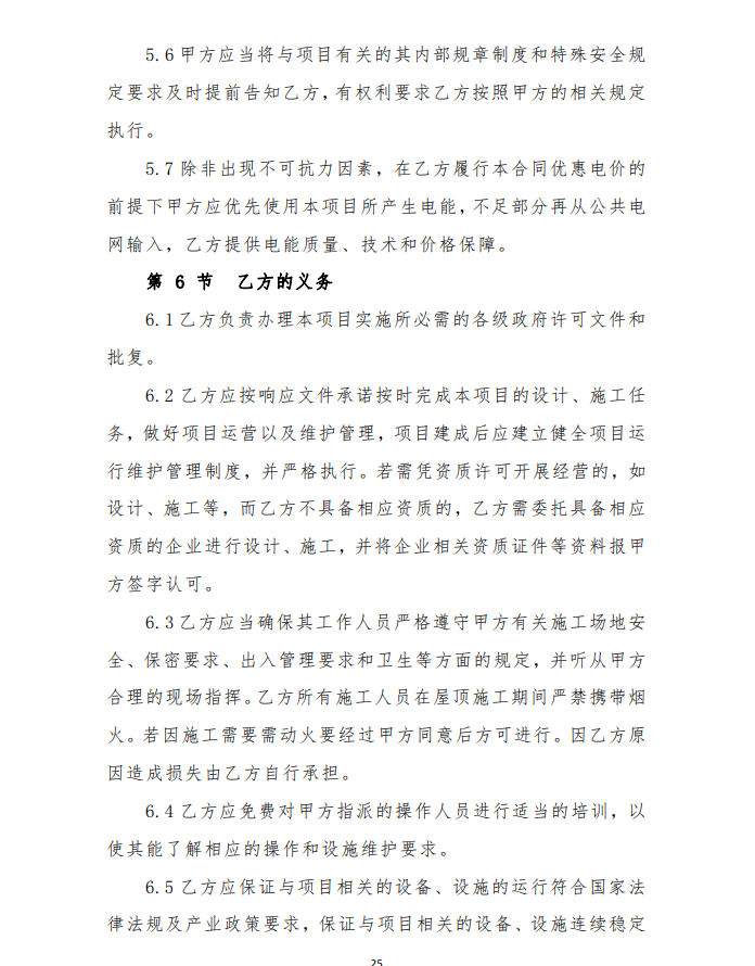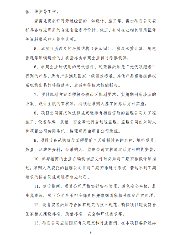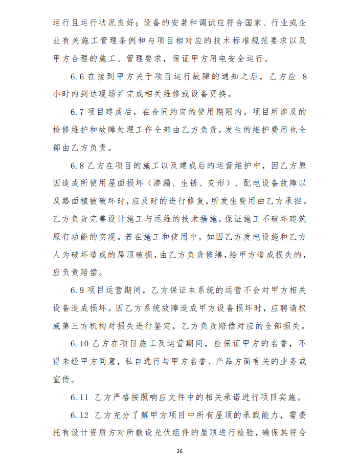 4、由于光伏發(fā)電項(xiàng)目運(yùn)行生命周期長,安裝用戶點(diǎn)多,面大,為保障安裝戶的權(quán)益,維護(hù)社會(huì)穩(wěn)定,建設(shè)企業(yè)要提供明確的長期運(yùn)維方案及保障費(fèi)用,具體以運(yùn)維合同為準(zhǔn)。