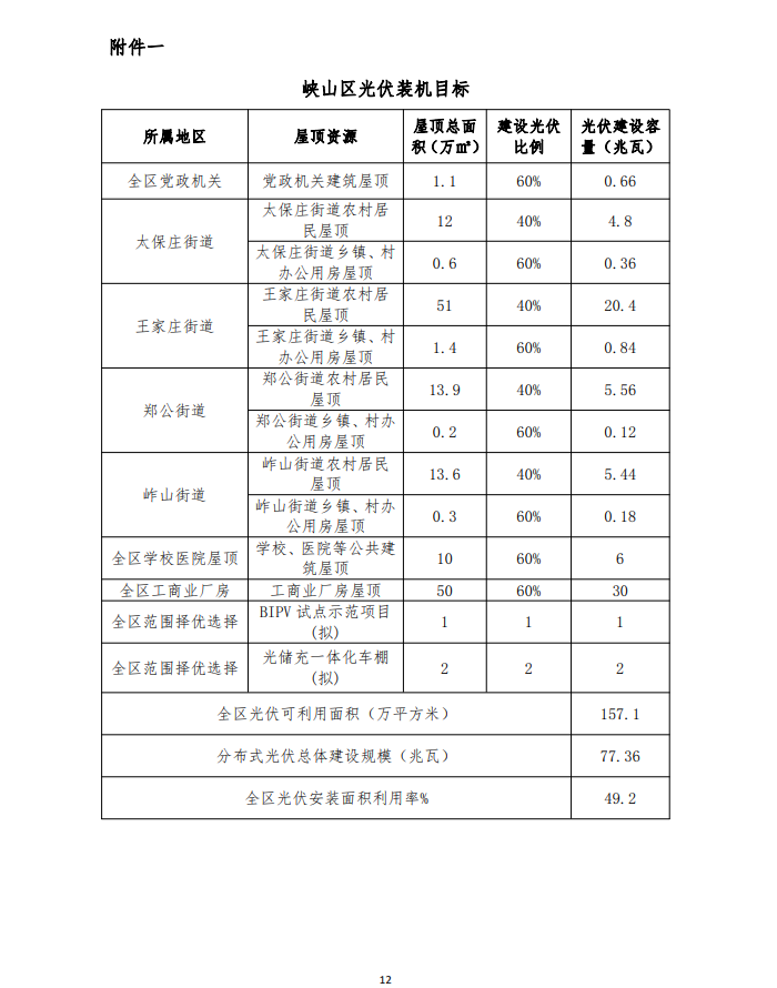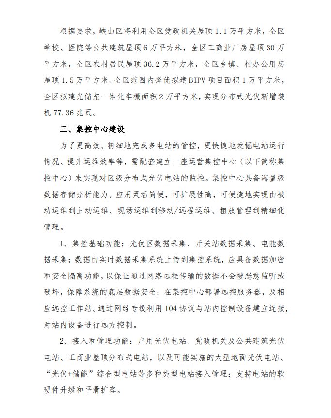 為深入貫徹落實(shí)鄉(xiāng)村振興戰(zhàn)略,努力實(shí)現(xiàn)國家碳達(dá)峰、碳中和戰(zhàn)略任務(wù),統(tǒng)籌推進(jìn)“源網(wǎng)荷儲(chǔ)-智慧協(xié)同”的分布式光伏建設(shè),打造全國“雙碳”示范區(qū),根據(jù)峽山區(qū)本地光照條件和屋頂資源情況,結(jié)合國家能源局政策要求,峽山區(qū)將利用全區(qū)黨政機(jī)關(guān)屋頂 1.1 萬平方米,全區(qū)學(xué)校、醫(yī)院等公共建筑屋頂 6 萬平方米,全區(qū)工商業(yè)廠房屋頂 30 萬平方米,全區(qū)農(nóng)村居民屋頂36.2 萬平方米,全區(qū)鄉(xiāng)鎮(zhèn)、村辦公用房屋頂 1.5 萬平方米,全區(qū)范圍內(nèi)擇優(yōu)擬建 BIPV 項(xiàng)目面積 1 萬平方米,全區(qū)擬建光儲(chǔ)充一體化車棚面積 2 萬平方米,實(shí)現(xiàn)分布式光伏新增裝機(jī) 77.36 兆瓦。