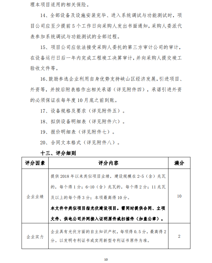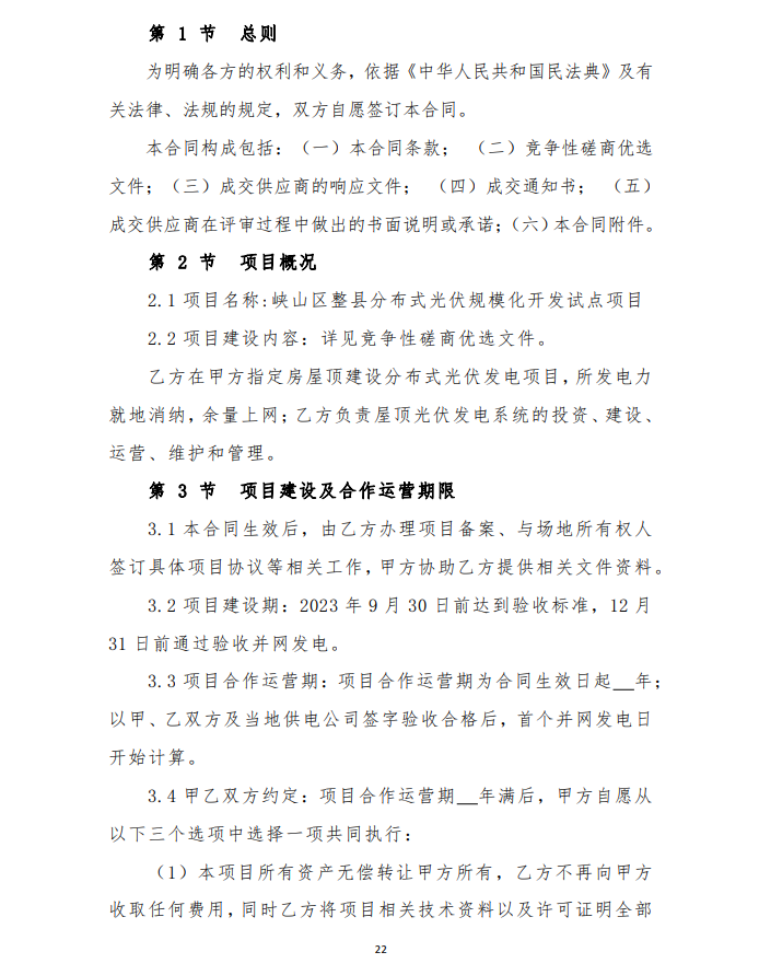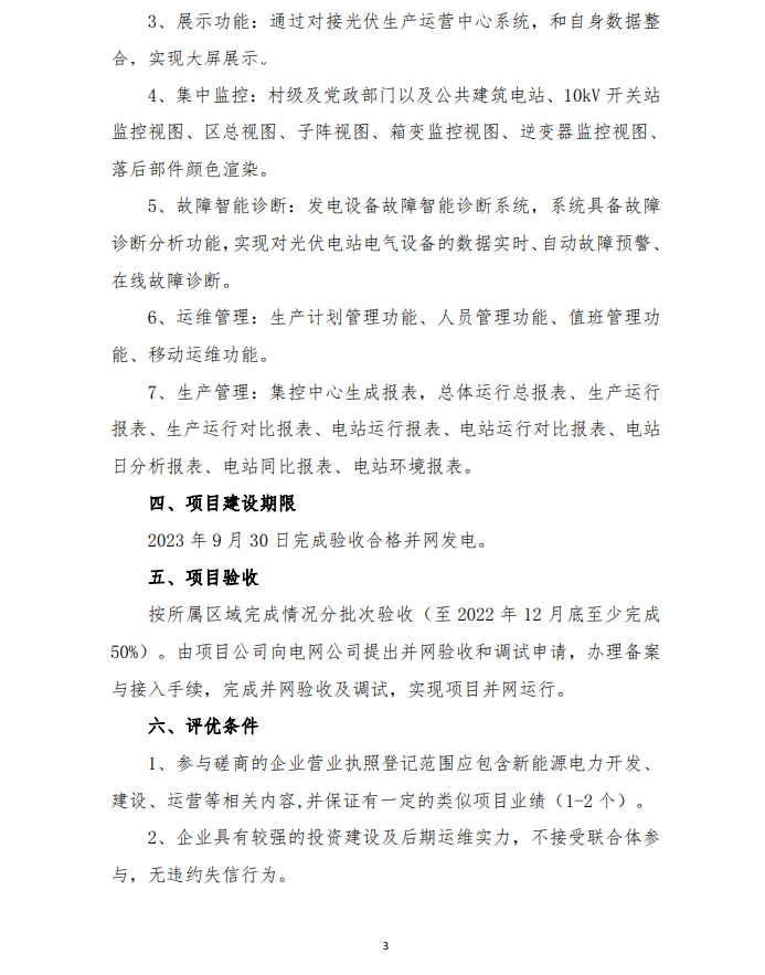 2月9日,山東濰坊峽山區(qū)發(fā)布整縣分布式光伏規(guī)?;_發(fā)試點(diǎn)項(xiàng)目競(jìng)爭(zhēng)性磋商二次公告,要求2023 年 9 月 30 日完成驗(yàn)收合格并網(wǎng)發(fā)電,按所屬區(qū)域完成情況分批次驗(yàn)收(至 2022 年 12 月底至少完成50%)。由項(xiàng)目公司向電網(wǎng)公司提出并網(wǎng)驗(yàn)收和調(diào)試申請(qǐng),辦理備案與接入手續(xù),完成并網(wǎng)驗(yàn)收及調(diào)試,實(shí)現(xiàn)項(xiàng)目并網(wǎng)運(yùn)行。至 2023 年底,光伏項(xiàng)目總投資約 4.0946 億元人民幣。