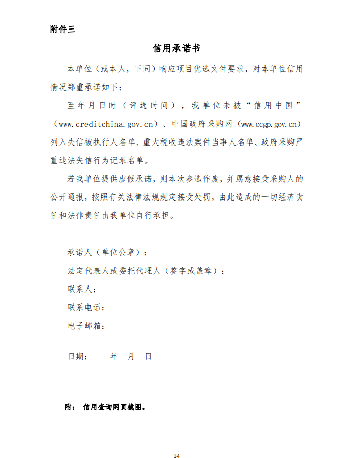6、參與磋商的企業(yè)未被列入“信用中國”網(wǎng)站(www.creditchina.gov.cn)記錄失信被執(zhí)行人或“重大稅收違法案件當(dāng)事人名單或企業(yè)經(jīng)營異常名錄”記錄名單;不處于中國政府采購網(wǎng)(www.ccgp.gov.cn)政府采購嚴(yán)重違法失信行為信息記錄”中的禁止參加政府采購活動(dòng)期間;(詳見附件,以上資料查詢時(shí)間以本項(xiàng)目磋商優(yōu)選文件發(fā)布至截止時(shí)間前為準(zhǔn),如相關(guān)失信記錄已失效,參與企業(yè)需提供相關(guān)證明資料)。