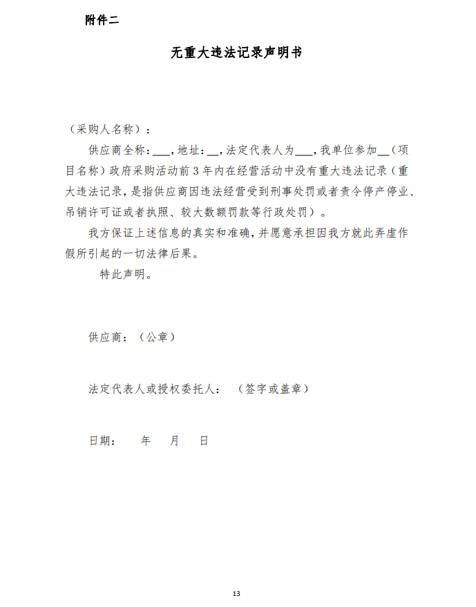 5、參與磋商的企業(yè)在參與政府采購項(xiàng)目3年內(nèi)在經(jīng)營活動(dòng)中無違法記錄的書面聲明(詳見附件)。