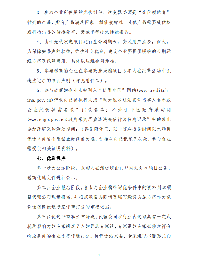 峽山區(qū)整縣分布式光伏規(guī)?;_發(fā)試點(diǎn)項(xiàng)目的潛在供應(yīng)商應(yīng)在濰坊市北海路1666號(hào)明東大廈十樓(澳思汀酒店)獲取采購文件,并于2022年2月23日9時(shí)0分(北京時(shí)間)前提交響應(yīng)文件。