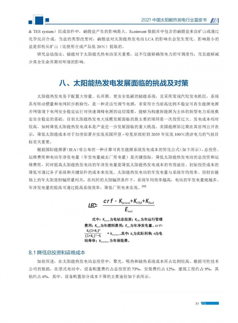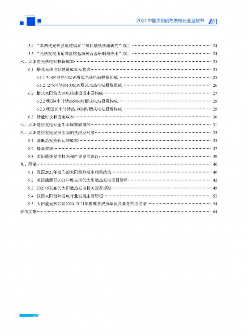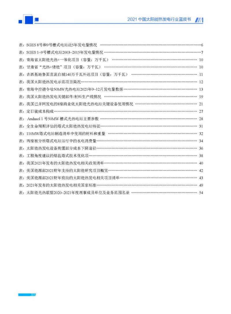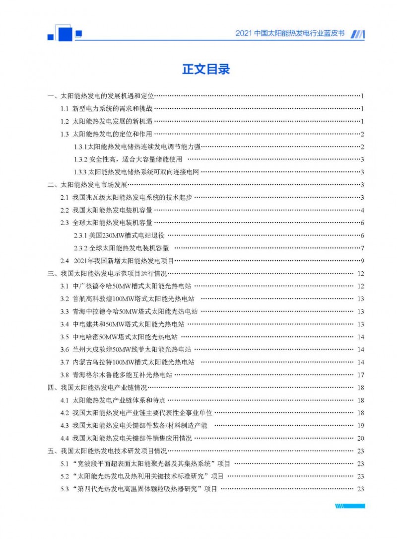 2021中國太陽能熱發(fā)電行業(yè)藍皮書(以下簡稱“藍皮書”)共分為9個章節(jié),分別為:太陽能熱發(fā)電的發(fā)展機遇和定位、太陽能熱發(fā)電市場發(fā)展、我國太陽能熱發(fā)電示范項目運行情況、我國太陽能熱發(fā)電產(chǎn)業(yè)鏈情況、我國太陽能熱發(fā)電研發(fā)項目情況、太陽能熱發(fā)電投資成本、太陽能熱發(fā)電站全生命周期碳排放、太陽能熱發(fā)電發(fā)展面臨的挑戰(zhàn)及對策,以及附錄。附錄主要包括:我國2021年發(fā)布的太陽能熱發(fā)電項目政策、美國能源部2021年度支持的太陽能熱發(fā)電項目清單、2021年發(fā)布的太陽能熱發(fā)電相關國家標準、我國太陽能熱發(fā)電行業(yè)發(fā)展主要歷程、太陽能光熱聯(lián)盟理事成員單位及業(yè)務范圍名錄。全文4.5萬+字,共55張圖表。