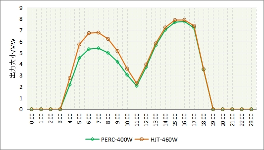 由于組件正面朝西,背面朝東,上午時(shí)刻,組件背面接收輻射,由于異質(zhì)結(jié)組件的雙面率較高,因此總體出力大小高于PERC組件。到了下午,太陽照射在組件的正面,雖然背面的輻射接收量較小,但是異質(zhì)結(jié)組件的出力大小仍略高于PERC組件。