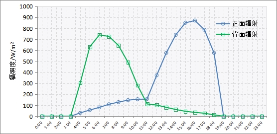 圖3為典型日的正面背面輻照度比較,輻照度大小與太陽的方位有關(guān)。上午時(shí)刻,太陽的方位位于東面,組件背面主要接收直接輻射、地面的反射和大氣中的散射輻射,組件正面主要接收大氣中的散射輻射和地面的一部分反射輻射,而到了下午正好相反。