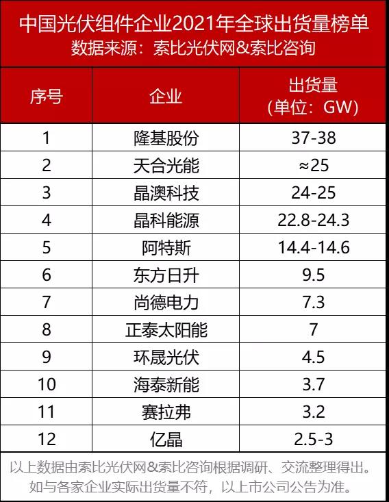 從索比光伏網(wǎng)&索比咨詢發(fā)布的《中國光伏組件企業(yè)2021年全球出貨量榜單》看,隆基股份、天合光能、晶澳科技、晶科能源、阿特斯、東方日升、尚德電力、正泰太陽能、環(huán)晟光伏、海泰新能、賽拉弗、億晶光電等企業(yè)名列前茅,出貨量合計約140GW,占全球組件總需求的75%以上。無論在國內(nèi)還是海外市場,他們都斬獲頗豐。