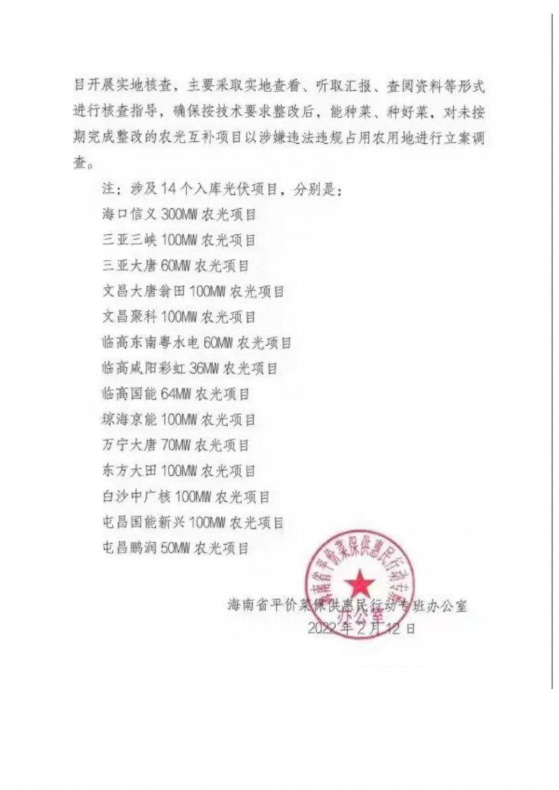 三是開(kāi)展實(shí)地核查。2月下旬,省平價(jià)菜專班組織省發(fā)改、農(nóng)業(yè)農(nóng)村、資規(guī)、測(cè)繪等部門成立2個(gè)小組赴相關(guān)市縣對(duì)農(nóng)光互補(bǔ)項(xiàng)目開(kāi)展實(shí)地核查,主要采取實(shí)地查看、聽(tīng)取匯報(bào)、查閱資料等形式進(jìn)行核查指導(dǎo),確保按技術(shù)要求整改后,能種菜、種好菜,對(duì)未按期完成整改的農(nóng)光互補(bǔ)項(xiàng)目以涉嫌違法違規(guī)占用農(nóng)用地進(jìn)行立案調(diào)查。