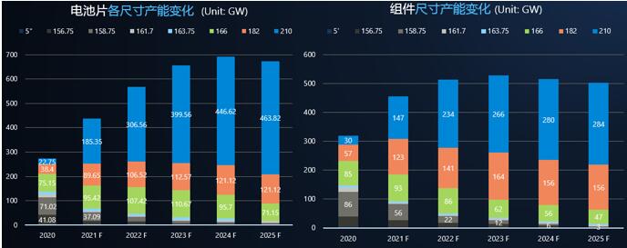 根據(jù)PVinfolink預(yù)測,210組件將逐步成為市場的主流技術(shù),2022年 210尺寸電池及組件產(chǎn)能分別達(dá)到306GW/234GW。