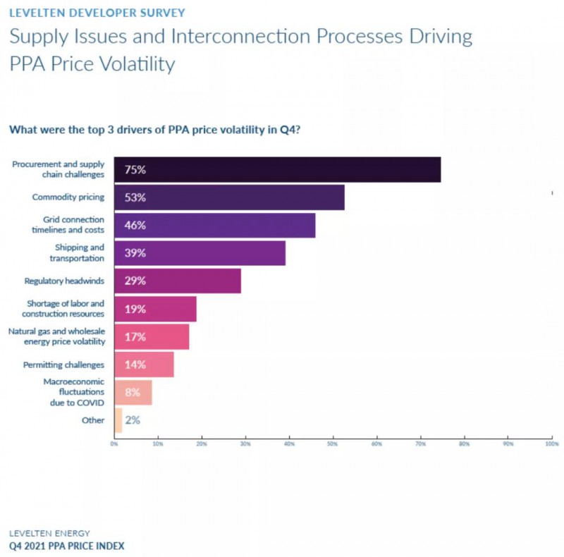 上述創(chuàng)紀錄的太陽能光伏的采購是在光伏成本上升的情況下發(fā)生的。LevelTen Energy的一項調(diào)查表明,由于需求增加、宏觀經(jīng)濟波動、供應(yīng)鏈問題以及其他因素的影響,光伏成本從 2020 年初開始上漲。據(jù)LevelTen Energy 的最新報告, 2021 年第四季度購電協(xié)議( PPA) 價格指數(shù)顯示光伏價格上漲了 5.7%,達到34.25 美元/兆瓦時。