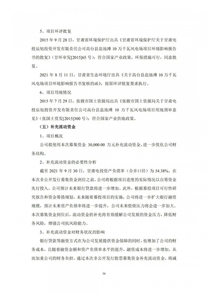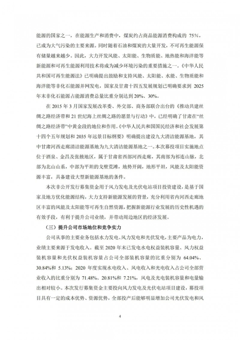 2月21日,甘肅電投發(fā)布公告,擬定增募資不超過12億元,用于玉門市麻黃灘第一風電場C區(qū)200兆瓦項目、瓜州干河口200MW光伏項目、永昌河清灘300MW光伏發(fā)電項目、高臺縣鹽池灘100MW風電場項目及補充流動資金。天眼查app顯示,公司是于1997年7月8日經(jīng)甘肅省人民政府甘政函[1997]36號文件批準,由西北油漆廠獨家發(fā)起,部分改制,采用募集設(shè)立方式設(shè)立的股份有限公司。公司1997年8月29日向社會公眾公開發(fā)行4500萬股人民幣普通股,并于1997年9月23在甘肅省工商行政管理局登記注冊。1997年10月14日經(jīng)中國證券監(jiān)督管理委員會批準,公司股票在深圳證券交易所上市交易。自2012年12月21日起,公司名稱由"西北永新化工股份有限公司"變更為"甘肅電投能源發(fā)展股份有限公司"。