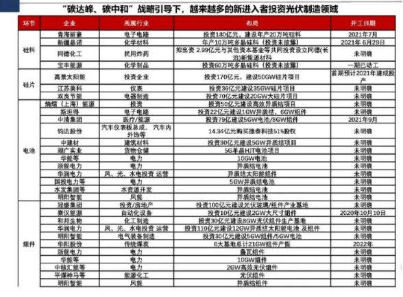 近年來(lái)光伏產(chǎn)業(yè)發(fā)展迅速,疫情、產(chǎn)業(yè)鏈漲價(jià)等因素下仍屢創(chuàng)新高,跨界入局者屢見(jiàn)不鮮,成功者也不在少數(shù),前有華為的逆變器、比亞迪的組件,后有高景的硅片、金陽(yáng)新能源的異質(zhì)結(jié),吉利、順豐、長(zhǎng)城、同德化工、海螺水泥、和邦生物等實(shí)力玩家也紛紛入場(chǎng)。