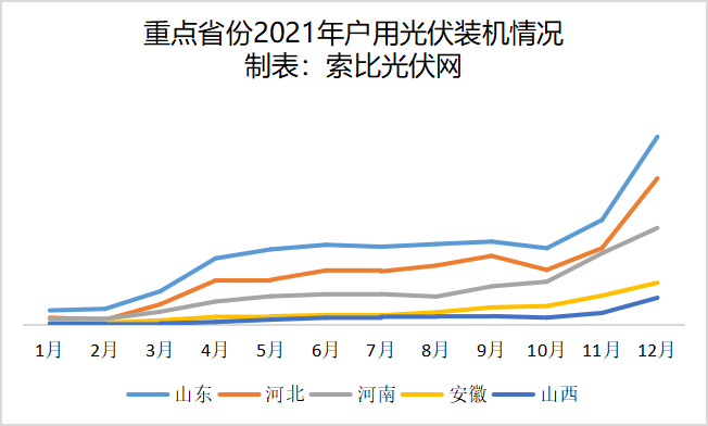 從2021年各省戶用光伏裝機(jī)規(guī)???,山東、河北、河南依然是最核心的三個(gè)主力市場(chǎng),安徽、山西、江西、福建、江蘇等5個(gè)省也實(shí)現(xiàn)了裝機(jī)超400MW、占比超2%的目標(biāo)。
