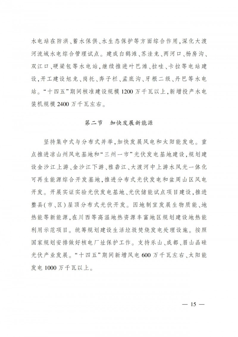 堅(jiān)持集中式與分布式并舉,加快發(fā)展風(fēng)電和太陽(yáng)能發(fā)電。重點(diǎn)推進(jìn)涼山州風(fēng)電基地和“三州一市”光伏發(fā)電基地建設(shè),規(guī)劃建設(shè)金沙江上游、金沙江下游、雅礱江、大渡河中上游水風(fēng)光一體化可再生能源綜合開發(fā)基地,推進(jìn)分布式光伏發(fā)電和盆周山區(qū)風(fēng)電開發(fā)。開展實(shí)證實(shí)驗(yàn)光伏發(fā)電基地、光伏儲(chǔ)能試點(diǎn)項(xiàng)目建設(shè),推進(jìn)整縣(市、區(qū))屋頂分布式光伏開發(fā)。因地制宜發(fā)展生物質(zhì)能、地?zé)崮艿刃履茉?在川西等高溫地?zé)豳Y源豐富地區(qū)規(guī)劃建設(shè)地?zé)崮芾檬痉俄?xiàng)目。統(tǒng)籌規(guī)劃建設(shè)生活垃圾焚燒發(fā)電處理設(shè)施。按照國(guó)家規(guī)劃安排做好核電廠址保護(hù)工作。支持樂(lè)山、成都、眉山晶硅光伏產(chǎn)業(yè)發(fā)展。“十四五”期間新增風(fēng)電600萬(wàn)千瓦左右、太陽(yáng)能發(fā)電1000萬(wàn)千瓦以上。