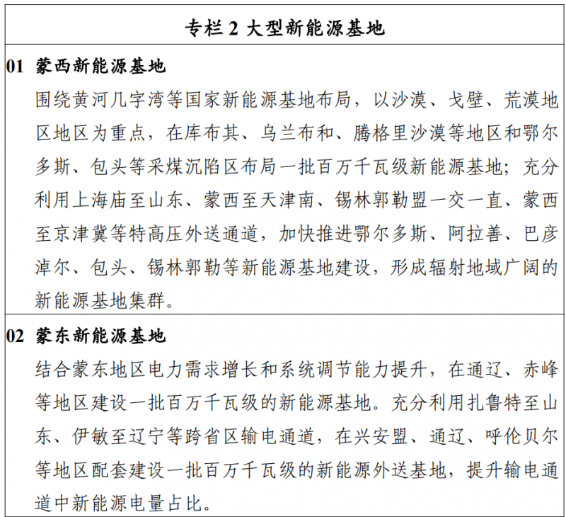 因地制宜推進(jìn)太陽(yáng)能熱發(fā)電發(fā)展??偨Y(jié)首批太陽(yáng)能熱發(fā)電示范項(xiàng)目建設(shè)經(jīng)驗(yàn),發(fā)揮太陽(yáng)能熱發(fā)電儲(chǔ)能調(diào)節(jié)能力和系統(tǒng)支撐能力,因地制宜建設(shè)太陽(yáng)能熱發(fā)電項(xiàng)目。充分發(fā)揮太陽(yáng)能熱發(fā)電在電力系統(tǒng)中調(diào)峰、調(diào)頻、儲(chǔ)能等多元功能,統(tǒng) 籌推動(dòng)太陽(yáng)能熱發(fā)電與風(fēng)電光伏基地一體化建設(shè)運(yùn)行,為新能源高比例自用和外送提供支撐,力爭(zhēng)“十四五”期間新增并網(wǎng)太陽(yáng)能熱發(fā)電項(xiàng)目 50 萬千瓦。加快推進(jìn)新型儲(chǔ)能技術(shù)規(guī)模化應(yīng)用。探索采用自建、合建、租賃和共享等多元化模式,加快推動(dòng)新型儲(chǔ)能在發(fā)電側(cè)、 電網(wǎng)側(cè)、用戶側(cè)的規(guī)模化應(yīng)用,實(shí)現(xiàn)新能源與新型儲(chǔ)能的協(xié)同發(fā)展,原則上新建新能源項(xiàng)目要配置 15%(2 小時(shí))以上的儲(chǔ)能設(shè)施。研究出臺(tái)存量新能源項(xiàng)目增配儲(chǔ)能的管理辦法,推動(dòng)已并網(wǎng)的新能源項(xiàng)目增配儲(chǔ)能設(shè)施,提高消納和調(diào)峰能力。在充分發(fā)揮電力外送通道配套火電機(jī)組深度調(diào)峰能力的基礎(chǔ)上,合理規(guī)劃建設(shè)送端配套新型儲(chǔ)能設(shè)施,支撐大規(guī)模風(fēng)、光等可再生能源電源接入,提升外送通道可再生能源電量占比。二、充分提升可再生能源就地消納水平加快配套電網(wǎng)建設(shè)。優(yōu)化升級(jí)電網(wǎng)主網(wǎng)架,解決電網(wǎng)結(jié)構(gòu)性問題,提升電力互濟(jì)能力,提高電網(wǎng)運(yùn)行效率和安全穩(wěn)定水平。加快推動(dòng)新能源送出工程建設(shè),滿足新能源大規(guī)模開發(fā)的匯集與送出需求。推動(dòng)配電網(wǎng)擴(kuò)容改造和智能化升 級(jí),提升配電網(wǎng)柔性開放接入能力、靈活控制能力和抗擾動(dòng)能力,增加電網(wǎng)就地就近平衡能力,構(gòu)建適應(yīng)分布式可再生能源并網(wǎng)和多元負(fù)荷需要的智能配電網(wǎng)。提升系統(tǒng)調(diào)節(jié)能力。積極推進(jìn)煤電靈活性改造,推動(dòng)自備電廠主動(dòng)參與調(diào)峰,加快建設(shè)天然氣調(diào)峰電站,充分提升系統(tǒng)調(diào)節(jié)能力。優(yōu)化電力調(diào)度運(yùn)行,合理安排系統(tǒng)開機(jī)方式, 動(dòng)態(tài)調(diào)整各類電源發(fā)電計(jì)劃,探索推進(jìn)多種電源聯(lián)合調(diào)度。創(chuàng)新調(diào)度運(yùn)行與市場(chǎng)機(jī)制,促進(jìn)可再生能源在省級(jí)電網(wǎng)內(nèi)就地消納。三、穩(wěn)步有序推動(dòng)可再生能源外送消納充分發(fā)揮自治區(qū)可再生能源資源優(yōu)勢(shì)和區(qū)位優(yōu)勢(shì),按照提升一批、投產(chǎn)一批、開工一批的發(fā)展思路,努力提高輸電 通道中新能源電量的占比,提高特高壓輸電通道利用率,大力提升可再生能源外送消納能力,有序推動(dòng)國(guó)家級(jí)新能源電力供應(yīng)保障基地建設(shè),助力全國(guó)碳達(dá)峰碳中和。“十四五” 期間,規(guī)劃新增新能源外送基地 2900 萬千瓦,力爭(zhēng)累計(jì)投產(chǎn) 3900 萬千瓦。加快推動(dòng)已批復(fù)新能源外送基地投產(chǎn)運(yùn)行。加快推動(dòng)錫林郭勒盟“一交一直”一期、上海廟至山東一期、扎魯特至青州特高壓輸電通道配套新能源基地、烏蘭察布風(fēng)電基地等已批復(fù)新能源基地建設(shè)進(jìn)度,力爭(zhēng) 2025 年前建成投產(chǎn) 1500 萬千瓦左右。提升既有外送通道中新能源電量占比。提高自治區(qū)可再生能源外送規(guī)模,在蒙西至天津南交流特高壓、上海廟至山 東直流特高壓、錫林郭勒盟交直流特高壓等既有特高壓外送 輸電通道以及傳統(tǒng)火電廠外送專線基礎(chǔ)上,統(tǒng)籌送端周邊地區(qū)資源條件和環(huán)境約束,合理優(yōu)化風(fēng)能、太陽(yáng)能資源配置方 案,增配布局一批新能源基地,大幅提高存量外送輸電通道中可再生能源占比和通道利用效率,“十四五”期間建成外送新能源 1900 萬千瓦。積極推進(jìn)新建蒙西外送通道配套新能源基地開工建設(shè)。統(tǒng)籌優(yōu)化蒙西地區(qū)風(fēng)能、太陽(yáng)能資源和接入條件,在資源稟賦較好、開發(fā)建設(shè)條件優(yōu)越、具備持續(xù)整裝開發(fā)條件的地區(qū), 推進(jìn)風(fēng)能、太陽(yáng)能、煤炭等多能互補(bǔ)發(fā)展,有序建設(shè)一批百萬千瓦級(jí)新能源基地,實(shí)現(xiàn)高比例可再生能源外送,力爭(zhēng)2025 年前推動(dòng)開工配套新能源基地 1000 萬千瓦。