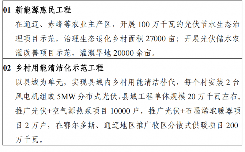 五、加快推動(dòng)農(nóng)村能源革命助力鄉(xiāng)村振興新能源惠民工程。開展農(nóng)網(wǎng)鞏固提升工程,與提升風(fēng)電、光伏等分布式電能就近接入有機(jī)結(jié)合,提升鄉(xiāng)村電氣化水平,提高農(nóng)電服務(wù)水平,推進(jìn)農(nóng)網(wǎng)智能化。在電網(wǎng)基礎(chǔ)建設(shè)薄弱且用電負(fù)荷分散度較高的偏遠(yuǎn)末端配電網(wǎng)、農(nóng)區(qū)牧區(qū)等地區(qū),因地制宜推動(dòng)風(fēng)電、光伏開發(fā)。在通遼、赤峰等盟市, 開展光伏儲(chǔ)水農(nóng)灌改善工程和光伏節(jié)水生態(tài)治理工程示范, 提升電網(wǎng)農(nóng)灌期供電可靠性,構(gòu)建新型節(jié)水灌溉系統(tǒng),有效實(shí)現(xiàn)節(jié)水節(jié)能、生態(tài)恢復(fù)治理。自治區(qū)鄉(xiāng)村人口約 960 萬人,開展 100 萬千瓦新能源惠民工程,滿足農(nóng)村牧區(qū)清潔用能需求。鄉(xiāng)村用能清潔化示范工程。推動(dòng)鄉(xiāng)村產(chǎn)業(yè)、農(nóng)業(yè)生產(chǎn)和農(nóng)村生活用能清潔化,以分布式光伏、分散式風(fēng)電、地?zé)崮芾脼楹诵模_展智慧用能大棚、清潔供暖、綠色出行等智慧用能示范。加快提升呼包鄂周邊、蒙東鄉(xiāng)村可再生能源供暖水平,合理配比分散式風(fēng)電和分布式光伏,利用電熱膜、電鍋爐、空氣源熱泵、石墨烯取暖器等供暖設(shè)施,形成清潔能源支持產(chǎn)業(yè)發(fā)展、產(chǎn)業(yè)發(fā)展助力鄉(xiāng)村振興的農(nóng)村安居環(huán) 境。在通遼、鄂爾多斯等農(nóng)牧區(qū),開展牧區(qū)清潔供暖示范項(xiàng)目,探索離網(wǎng)式新能源供電供熱模式,滿足農(nóng)村牧區(qū)清潔用能需求。在蒙東地區(qū)人口密集的旗縣,充分利用當(dāng)?shù)亟斩捹Y源開展生物質(zhì)發(fā)電供暖示范,實(shí)現(xiàn)旗縣區(qū)域生物質(zhì)供暖規(guī)模化替代,提升可再生能源消費(fèi)占比,推廣生物質(zhì)碳化與固化及高效低排節(jié)能爐具。
