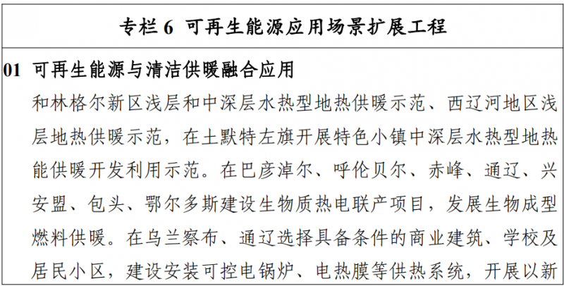 四、廣泛擴(kuò)展可再生能源應(yīng)用場(chǎng)景實(shí)施火電靈活性改造。加快存量煤電改造升級(jí),推廣深度調(diào)峰技術(shù)應(yīng)用,積極推進(jìn)現(xiàn)役煤電機(jī)組實(shí)施靈活性改造, 鼓勵(lì)新建煤電機(jī)組靈活性制造,降低新建煤電機(jī)組最小技術(shù)出力水平,提升電力系統(tǒng)整體消納能力,促進(jìn)新能源大規(guī)模開發(fā)和高效利用,引導(dǎo)煤電由主力電源逐步向“支撐型”、“調(diào) 節(jié)型”電源轉(zhuǎn)變。推進(jìn)工業(yè)園區(qū)可再生替代。充分挖掘燃煤自備電廠園區(qū)的電源靈活調(diào)節(jié)能力和負(fù)荷側(cè)需求響應(yīng)能力,推動(dòng)園區(qū)自備電廠參與調(diào)峰,改變單一依靠自備火電的傳統(tǒng)供能方式,因地制宜推動(dòng)風(fēng)電、光伏建設(shè),鼓勵(lì)集中式與分布式并舉,在 不占用公共電網(wǎng)的消納空間且保證用能安全的前提下實(shí)現(xiàn) 新能源全額自發(fā)自用,逐步實(shí)現(xiàn)園區(qū)用能清潔化。開展低碳工業(yè)園區(qū)示范。鼓勵(lì)具備新增負(fù)荷的園區(qū)開展低碳工業(yè)園示范項(xiàng)目,以近零碳用能為目標(biāo),率先開展全清潔能源供電,提升園區(qū)整體能效。通過自建分布式、新能源專線供電、綠色電力交易、綠證交易等多種方式,實(shí)現(xiàn)園區(qū)新增用電需求主要由新能源滿足。同時(shí),鼓勵(lì)園區(qū)通過配置儲(chǔ)能等措施,保證與園區(qū)負(fù)荷的匹配響應(yīng)和高比例自平衡, 不占用公共電網(wǎng)消納空間。推廣“綠電+綠氫”發(fā)展新模式。鼓勵(lì)采用具有適應(yīng)可再生能源出力波動(dòng)的綠色制氫技術(shù),加快推進(jìn)風(fēng)光氫儲(chǔ)一體化示范,推廣氫燃料電池汽車在礦山、物流、公交等領(lǐng)域的規(guī)?;瘧?yīng)用,積極探索氫能在冶金、化工、交通等領(lǐng)域的應(yīng)用。開展源網(wǎng)荷儲(chǔ)一體化示范。充分挖掘和釋放生產(chǎn)側(cè)、消費(fèi)側(cè)調(diào)節(jié)能力,最大化發(fā)揮負(fù)荷側(cè)調(diào)節(jié)響應(yīng)能力,就近合理配套新能源,加強(qiáng)源網(wǎng)荷儲(chǔ)多向互動(dòng),通過電價(jià)優(yōu)勢(shì)帶動(dòng)儲(chǔ)能、大數(shù)據(jù)、新能源、新材料等行業(yè)全產(chǎn)業(yè)鏈發(fā)展。加快烏蘭察布、通遼源網(wǎng)荷儲(chǔ)一體化示范工程建設(shè),提升本地電源支撐,有效緩解供電缺口,推動(dòng)局部新能源就近消納,不占用公共電網(wǎng)調(diào)峰和消納空間,提升新能源開發(fā)利用水平。持續(xù)推廣可再生能源清潔供暖。發(fā)揮自治區(qū)風(fēng)能、光伏、農(nóng)林、地?zé)豳Y源優(yōu)勢(shì),建立多元化可再生能源清潔供暖體系, 促進(jìn)環(huán)境質(zhì)量和人民生活條件改善。在呼包鄂城市群積極推動(dòng)中深層地?zé)崮芤?guī)?;┡痉叮瑒?chuàng)新城市用能新模式。在蒙東地區(qū)發(fā)展生物質(zhì)熱電聯(lián)產(chǎn)項(xiàng)目,探索以農(nóng)林生物質(zhì)、生物質(zhì)成型燃料等為燃料的生物質(zhì)鍋爐供熱方式,有效保護(hù)城鄉(xiāng)環(huán)境。在呼和浩特、包頭、烏蘭察布、通遼等地,開展清潔電供暖示范。大力發(fā)展以新能源為主的綜合能源應(yīng)用。結(jié)合配電網(wǎng)、燃?xì)饩W(wǎng)、熱力網(wǎng)等能源網(wǎng)絡(luò),綜合可再生能源、儲(chǔ)能、信息通訊等先進(jìn)技術(shù),推動(dòng)分布式可再生能源高效靈活接入與生產(chǎn)消費(fèi)一體化,建設(shè)冷熱水電氣供應(yīng)的區(qū)域綜合能源系統(tǒng)。