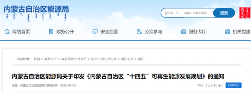 2022年3月2日,內(nèi)蒙古自治區(qū)能源局關(guān)于印發(fā)《內(nèi)蒙古自治區(qū)“十四五”可再生能源發(fā)展規(guī)劃》,提出:"十四五"末,內(nèi)蒙古可再生能源發(fā)電裝機(jī)達(dá)到 1.35 億千瓦以上,其中風(fēng)電 8900 萬千瓦、光伏發(fā)電 4500 萬千瓦,相當(dāng)于新增風(fēng)電項(xiàng)目5115萬千瓦,光伏項(xiàng)目3262萬千瓦,共8377萬千瓦,包含本地消納和外送兩類。平均利用率保持在 90%以上。同時(shí),將依據(jù)國(guó)土空間規(guī)劃,完善可再生能源空間用途管制規(guī)則,保障可再生能源開發(fā)利用合理的用地空間需求。落實(shí)草原林地征占用分區(qū)管控政策,保障可再生能源項(xiàng)目使用草原林地需求。規(guī)范土地性質(zhì)認(rèn)定,明確林草等不同地類的用地標(biāo)準(zhǔn)。