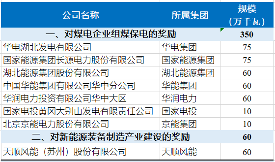 1)對(duì)煤電企業(yè)組煤保電的獎(jiǎng)勵(lì),350萬(wàn)千瓦;