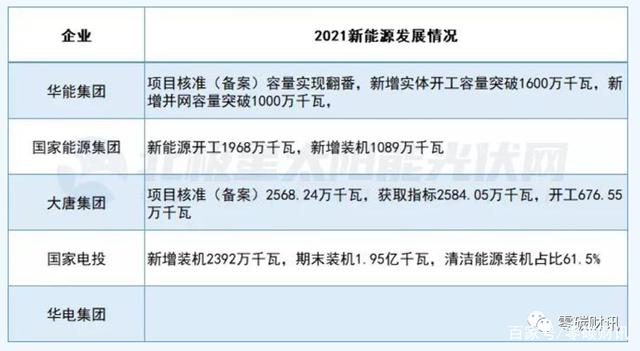 公開(kāi)數(shù)據(jù)顯示,2021年,華能集團(tuán)實(shí)現(xiàn)新能源新增并網(wǎng)超1000萬(wàn)千瓦,實(shí)體開(kāi)工超1600萬(wàn)千瓦、國(guó)家能源集團(tuán)新能源開(kāi)工1968萬(wàn)千瓦,新增裝機(jī)1089萬(wàn)千瓦、大唐集團(tuán)新能源項(xiàng)目核準(zhǔn)(備案)2568.24萬(wàn)千瓦,獲取指標(biāo)2584.05萬(wàn)千瓦。