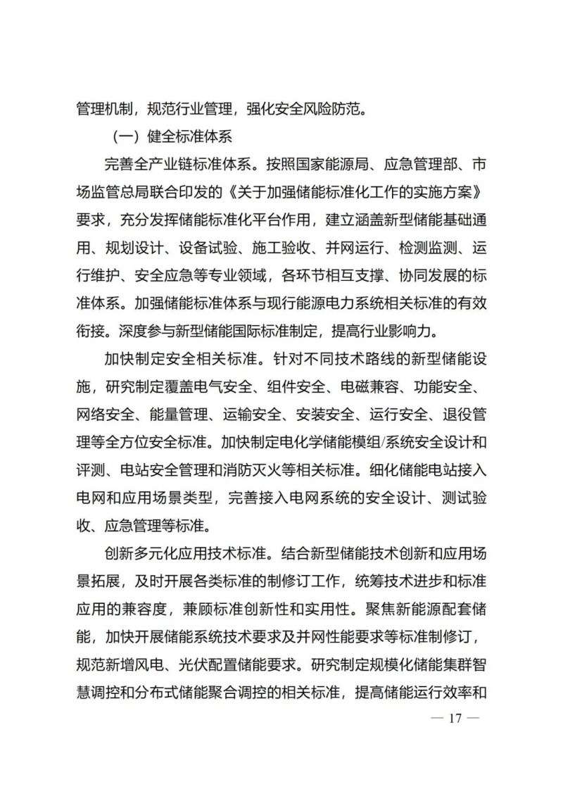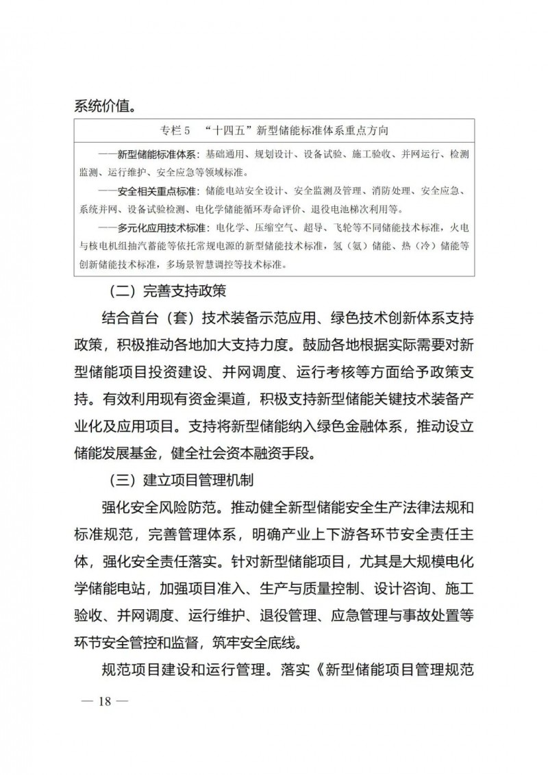五是著力健全新型儲能管理體系。《實施方案》強(qiáng)化標(biāo)準(zhǔn)的規(guī)范引領(lǐng)和安全保障作用,完善新型儲能全產(chǎn)業(yè)鏈標(biāo)準(zhǔn)體系,加快制定安全相關(guān)標(biāo)準(zhǔn),開展多元化應(yīng)用技術(shù)標(biāo)準(zhǔn)制修訂。要求加快建立新型儲能項目管理機(jī)制,規(guī)范行業(yè)管理,強(qiáng)化安全風(fēng)險防范。鼓勵各地加大新型儲能技術(shù)創(chuàng)新和項目建設(shè)支持力度,完善相關(guān)支持政策。加快建立新型儲能項目管理機(jī)制,強(qiáng)化安全風(fēng)險防范,規(guī)范項目建設(shè)和運(yùn)行管理。