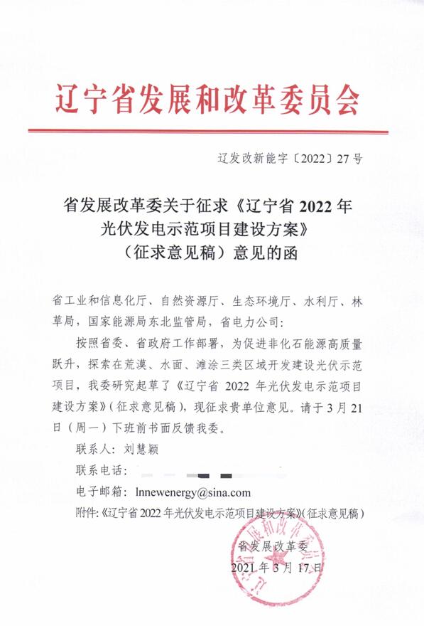 3月17日,遼寧省發(fā)展改革委關(guān)于征求《遼寧省2022年光伏發(fā)電示范項目建設(shè)方案》(征求意見稿)意見的函。