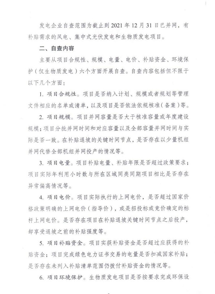 發(fā)電企業(yè)自查范圍為截止到2021年12月31日已并網(wǎng),有補(bǔ)貼需求的風(fēng)電、集中式光伏發(fā)電和生物質(zhì)發(fā)電項(xiàng)目。