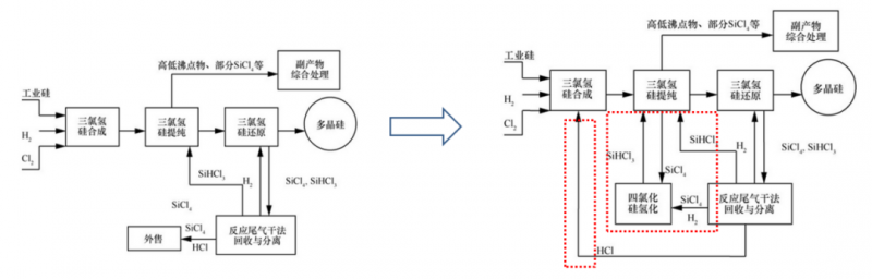 由于改良西門子法生成的副產(chǎn)物和尾氣較多,影響到生產(chǎn)成本。如何有效循環(huán)和處理產(chǎn)物關(guān)系到未來的降本方向。比如西門子法生產(chǎn)過程中會產(chǎn)生大量的副產(chǎn)物SiCl4,將SiCl4轉(zhuǎn)化成作為多晶硅生產(chǎn)原料的SiHCl3,從而實現(xiàn)閉環(huán)生產(chǎn),以提高硅粉利用率,降低生產(chǎn)成本。