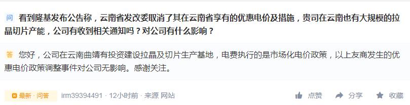 中環(huán)股份在接受媒體采訪時(shí)表示,云南取消隆基優(yōu)惠電價(jià)對(duì)公司沒有什么影響;而通威股份在接受媒體提問時(shí)則回應(yīng)稱,“我們沒有收到相關(guān)的通知”。