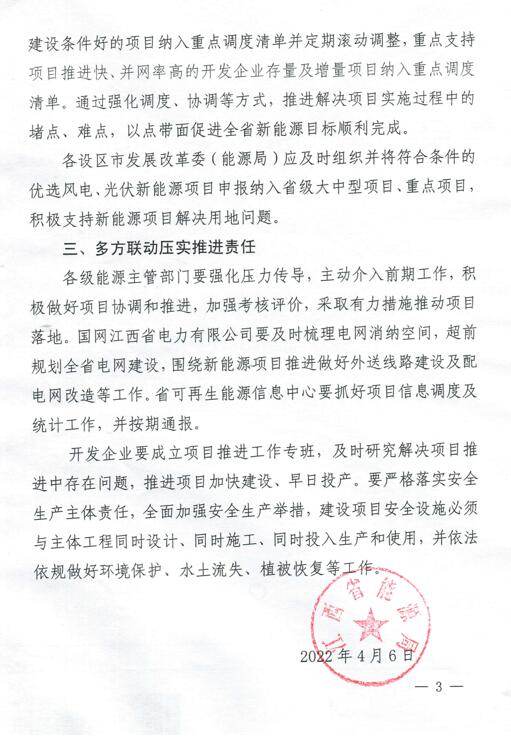 2022年4月6日,江西省能源局就加快我省新能源項目建設(shè)有關(guān)事項進行了通知,通知包含以下內(nèi)容:1.加快推進新能源項目建設(shè);2.建立重點項目調(diào)度機制;3.多方聯(lián)動壓實推進責(zé)任。