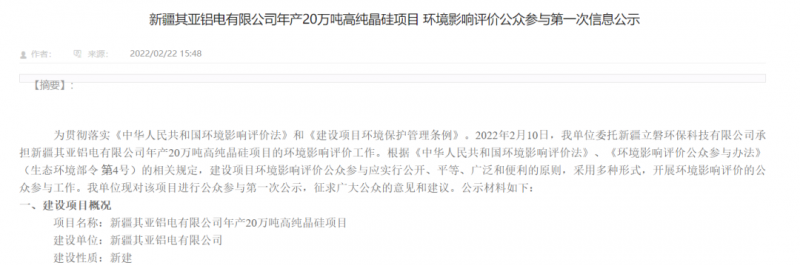 據(jù)知情人士向光伏見聞小編透漏,又一家鋁電企業(yè)其亞集團子公司新疆其亞鋁電有限公司大舉進軍多晶硅領域,其年產20萬噸高純晶硅項目在其亞集團官網(wǎng)進行了公示,其相關工作也已經在緊鑼密度的進行當中。