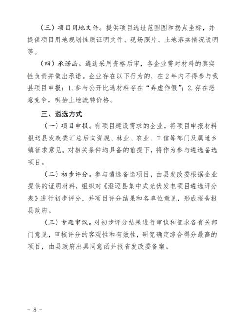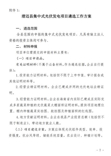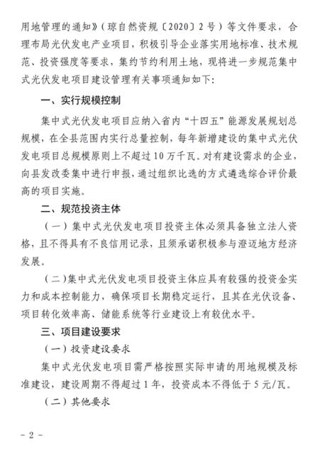 文件規(guī)定了澄邁縣集中式光伏發(fā)電項目應(yīng)納入省內(nèi)“十四五”能源發(fā)展規(guī)劃總規(guī)模,在全縣范圍內(nèi)實行總量控制,每年新增建設(shè)的集中式光伏發(fā)電項目總規(guī)模原則上不超過10萬千瓦。對有建設(shè)需求的企業(yè),向縣發(fā)改委集中進(jìn)行申報,通過組織比選的方式遴選綜合評價最高的項目實施。