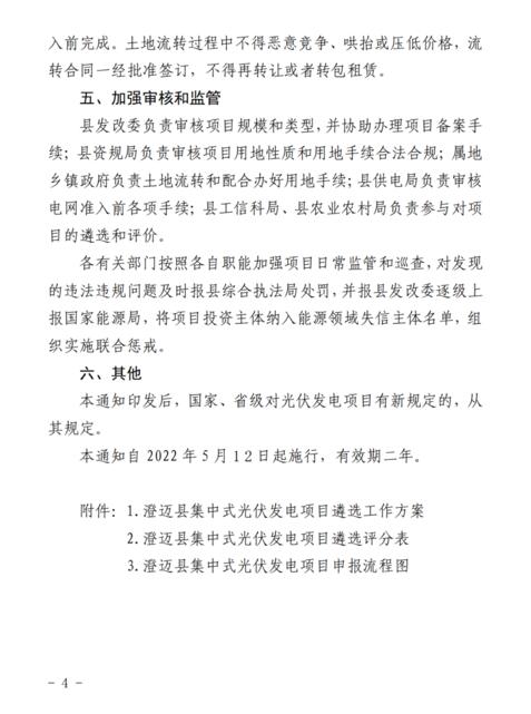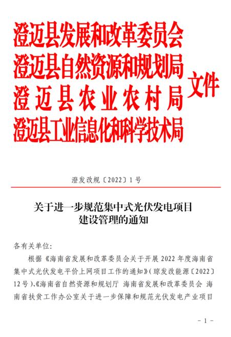4月11日,澄邁縣發(fā)展和改革委員會、澄邁縣自然資源和規(guī)劃局、澄邁縣農(nóng)業(yè)農(nóng)村局、澄邁縣工業(yè)信息化和科學(xué)技術(shù)局聯(lián)合發(fā)布了《關(guān)于進(jìn)一步規(guī)范集中式光伏發(fā)電項目建設(shè)管理的通知》。本通知自2022年5月12日起施行,有效期2年。