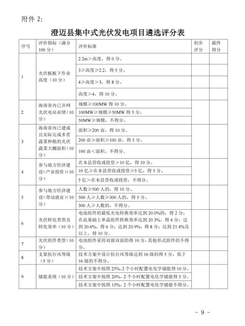 此外,根據(jù)澄邁縣集中式光伏發(fā)電項目遴選評分表,在澄邁縣營收或投資>10億,得10分;10億≥在本縣營收或投資≥5億,得5分;5億>在本縣營收或投資,不得分。配套儲能系統(tǒng)包括,技術(shù)方案中按照25%,2個小時配置電化學(xué)儲能得10分。按照20%,2個小時配置電化學(xué)儲能得5分。按照15%,2個小時配置電化學(xué)儲能不得分。