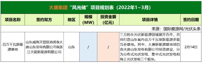 截至2022年3月31日,大唐集團(tuán)共簽約(規(guī)劃)1個風(fēng)光儲項目,該項目只簽署了合作協(xié)議。