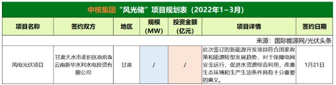 截至2022年3月31日,中核集團(tuán)共簽約(規(guī)劃)1個風(fēng)光儲項目,該項目只簽署了合作協(xié)議。
