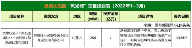 截至2022年3月31日,晶澳太陽能共簽約(規(guī)劃)1個風(fēng)光儲項目,項目規(guī)模為200MW。