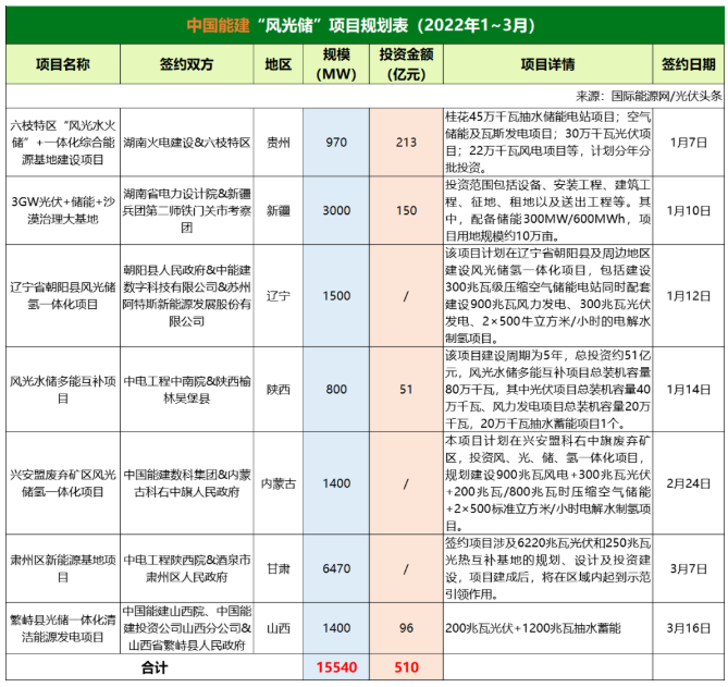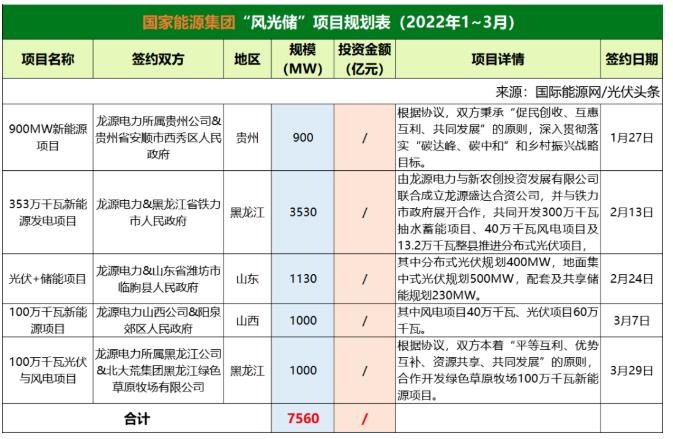 截至2022年3月31日,國家能源集團(tuán)共簽約(規(guī)劃)5個風(fēng)光儲項目,明確項目規(guī)模共計7.56GW。