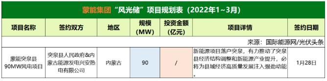 截至2022年3月31日,蒙能集團(tuán)共簽約(規(guī)劃)1個風(fēng)光儲項目,項目規(guī)模為90MW。