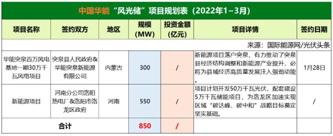 截至2022年3月31日,華能共簽約(規(guī)劃)2個風(fēng)光儲項目,明確規(guī)模共計850MW。