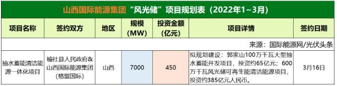 截至2022年3月31日,山西國際能源集團(tuán)共簽約(規(guī)劃)1個風(fēng)光儲項目,項目規(guī)模為7000MW,投資金額450億元。